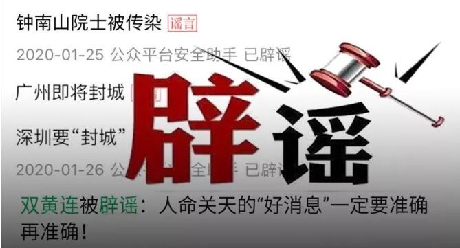从钟南山院士被病毒熏染到央视节目的假预告,从广深两地的先后封城再到双黄连口服液的全城疯抢……在短短一周的时间,腾讯辟谣小程序中关于疫情的辟谣资讯就凌驾了50条。
