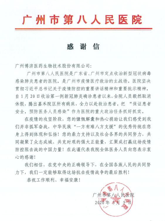 广州市第八人民医院、湘潭第一人民医院等医疗机构也纷纷发来谢谢信 ,谢谢bmw11222医药在要害时刻伸出援助之手 ,给予了医护职员战胜疫情的信心与实力 。
