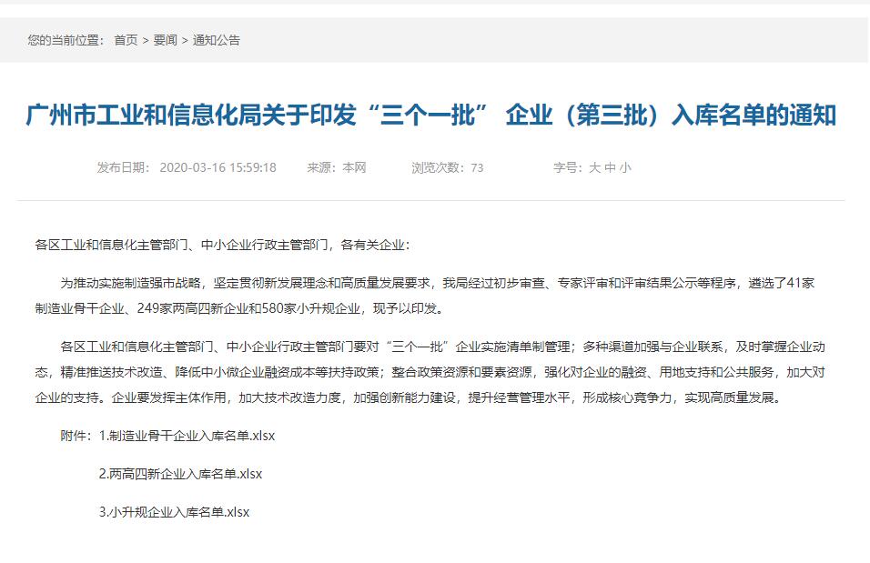 据相识,“三个一批”是广州市贯彻落实“中国制造2025”战略妄想,坚持新生长理念和高质量生长要求,进一步施展企业主体作用,支持企业加大技改力度,提升广州市工业投资强度,增进工业结构优化升级而启动的支持政策 。旨在做大做强一批制造业主干企业、提质增效一批“两高四新”企业、培育壮大一批“小升规”企业 。其中的“两高四新”是指切合高科技、高生长、新手艺、新工业、新业态、新模式的企业,该类型企业需贯彻新生长理念,并且切合高质量生长要求 。