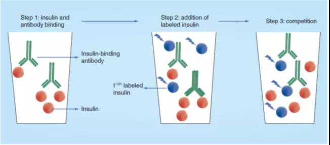 ÔÚÕâÖÖÒªÁìÖУ¬ÓÉÓÚȱ·¦ÈËÀàÒȵºËصĽᾧÌ壬Òò´ËI131±ê¼ÇµÄ½á¾§Å£ÒȵºËØ£¨ÒȵºËØ-I131£©±»ÓÃ×÷ʾ×Ù¼Á¡£´Ë RIA µÄÔÀíÊÇ»ùÓÚÑù±¾ÖеÄÈËÒȵºËØÓëëàÊóѪÇåÖеÄÒȵºËØÁ¬Ïµ¿¹ÌåµÄÇ¿Á¦Á¬Ïµ£¨Í¼2Öеİ취1£©£¬²¢ÈÃÒÑ֪Ũ¶ÈµÄÒȵºËØ-I131Óë¸Ã¿¹ÌåµÄÁ¬Ïµ¾ºÕù£¨Í¼2°ì·¨2-3£©¡£ÒȵºËØ-I131ÓëÒȵºËØÁ¬Ïµ¿¹ÌåµÄÁ¬ÏµÔÚÈÜÒºÖоÙÐУ¬ÓÎÀëµÄÒȵºËØ-I131ÓëÁ¬ÏµÁË¿¹ÌåµÄÒȵºËØ-I131µÄÊèɢͨ¹ýֽɫÆ×µçÓ¾ÊÖÒÕʵÏÖ£¬Õâ¾ÍʹµÃ¶¨Á¿²â¶¨ÒȵºËØ-I131³ÉΪ¿ÉÄÜ£¬Æä´ú±íÁËÑù±¾ÖÐÒȵºËصÄŨ¶È¡£ÔÚ´ËÒªÁìÖУ¬×îµÍ¿É¶¨Á¿µÄÒȵºËØÅ¨¶ÈΪ1.4¦ÌU¡£