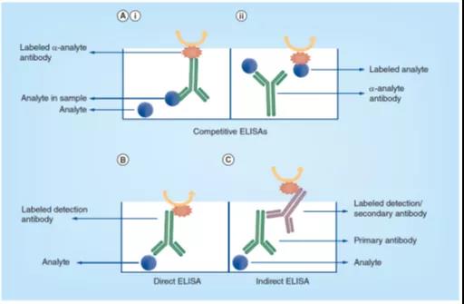 ͼ3. ¾ºÕùʽ£¨Ai & Aii£©¡¢Ö±½Ó£¨B£©ºÍ¼ä½Ó£¨C£©ELISA²âÊÔÃûÌõÄÔÀíͼ¡£Ä¿µÄÆÊÎöÎAnalyte£©´ú±í±»²â¶¨µÄÄ¿µÄÂѰ×ÖÊ¡£ÔÚ¾ºÕùʽELISAÖУ¬¿ÉÒÔ±ê¼ÇÄ¿µÄÆÊÎöÎï»ò¿¹Ì壬¶øÔÚÖ±½Ó»ò¼ä½ÓELISAÃûÌÃÖУ¬Ö»±ê¼Ç¼ì²â¿¹Ìå¡£