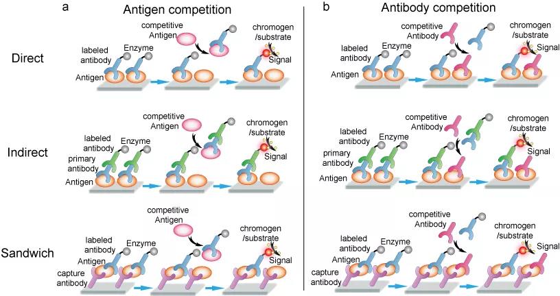 ÉÏÊöÃûÌÃÊÇELISAµÄ»ù±¾Éè¼Æ£¬ËùÖøÃûÌö¼¿ÉÒÔʹÓþºÕù»òÒÖÖÆÌõ¼þ¼ÓÒÔµ÷½â£¬À´²â¶¨¿¹Ô»ò¿¹Ì壨ͼ5£©£¬ËùÓÐÒªÁì¶¼ÒªÇóÓëÊÔ¼ÁÔ¤ÏÈ·´Ó¦/·õÓý²Å»ªµÖ´ï×î¼Ñ״̬¡£ÕâЩ×î¼Ñ״̬¿ÉÒÔͨ¹ýÌí¼Ó¿¹Ô£¨Í¼5a£©»ò¿¹Ì壨ͼ5b£©À´¸øÓèÌôÕ½¡£Ëæ×ÅÈÜÒºÖÐÓÎÀëµÄ¿¹Ô£¨¿¹Ì壩µÄÔöÌí£¬Äܹ»ÓëÀο¿µ×Îimmobilized substrate£©Á¬ÏµµÄ¿¹Ì壨¿¹Ô£©µÄÊýÄ¿ÔòïÔÌ¡£Ï´µÓ°ì·¨ºó£¬Ìí¼ÓÉúÉ«¼Áµ×Îchromophore substrate£©ÒÔ±¬·¢Ðźţ¨ÑÕɫת±ä»ò·¢¹â£©¡£¿¹Ìå/¿¹ÔÌôÕ½ÒýÆðµÄÐźÅת±äÕ¹ÏÖÁËÓйؾºÕùÐÔ¿¹Ô/¿¹ÌåµÄÐÅÏ¢¡£¾ºÕùʽELISA¹ØÓÚ²â¶¨ÖØ´ó»ìÏýÎïÖеĿ¹ÔŨ¶ÈÏ൱ÓÐÓã¬ÌØÊâÊÇÔÚ¿ÉÄܺ¬Óп¹ÔµÄδ֪ÑùÆ·Ó뺬ÓÐÒÑÖªÊýÄ¿µÄ´¿»¯¿¹ÔµÄÀàËÆÑùƷʱ¡£
