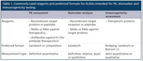 Ò»¸öELISAÒªÁì×îÖ÷ÒªµÄ×é³É²¿·ÖÊDzâÊÔÊÔ¼Á£¬Ëü¾öÒéÁËELISAÒªÁìµÄѸËÙ¶È¡¢ÌØÒìÐÔºÍÒªÁìµÄÖÊÁ¿¡£ELISAs³£ÓÃÓÚÒ©Î↑·¢£ºÔÚPKÆÀ¹ÀÖУ¬¶¨Á¿²â¶¨ÂѰ×ÉúÎïÒ©µÄŨ¶È£»²â¶¨ÄÚÔ´ÐÔÂѰ׺ÍÉúÎï±ê¼ÇÎ¼ì²â¿¹Ò©ÎÌåµÄ±£´æÒÔ¾ÙÐÐÃâÒßÔÐÔÆÀ¹ÀµÈ¡£LBAÒªÁìÊ×Ñ¡µÄÒªº¦ÊÔ¼ÁÊǵ¥¿Ë¡¿¹Ì壨MAbs£©»ò¶à¿Ë¡¿¹Ì壨PAbs£©£¬¶ø²»ÊÇÖØ×é°Ð±êÂѰס£ÎªÁ˱¬·¢PAbs»òMAbs£¬ÐèÒª½«ÉúÎïÒ©»òÉúÎï±ê¼ÇÎïÂѰ׼°Æä×ô¼Á»òÔØÌ壬ƾ֤Ïà¹ØÓ¦Óøøµ½ºÏÊʵÄËÞ×Ô¶¯ÎïÎïÖÖÉϾÙÐÐÃâÒß¡£¹ØÓÚPAbs£¬ÍÃ×Ó¡¢É½ÑòºÍÃàÑòÊÇ×î³£ÓõÄËÞÖ÷ÎïÖÖ£¬ÓÉÓÚËüÃǵÄÌåÐʹ󣨱¬·¢µÄ¿¹ÌåÁ¿Ò²´ó£©£¬ÈÝÒ×ÕÒµ½Ñª¹ÜºÍǿ׳µÄÃâÒß·´Ó¦¡£
