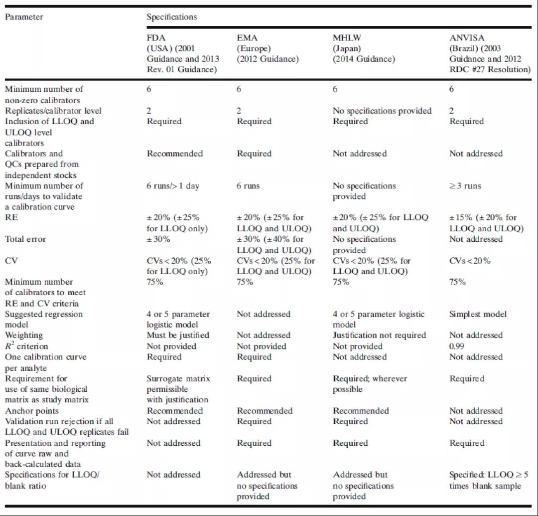 Ä¿½ñ£¬Ò»Ð©ÉúÎïÆÊÎöÖ¸ÄÏ»ò¹æÔòÎļþµÄÉúÎïÆÊÎö²¿·ÖÒѾ¶ÔУ׼±ê×¼ÇúÏßµÄ×îµÍÒªÇó¾ÙÐÐÁËÈ·¶¨¡£ÕâЩָµ¼ÐÔÎļþ¶ÔLBAÇúÏßµÄÐèÇóºÍÐÔÄÜÔ¤ÆÚͨ³£ÊÇÏ໥һÖµġ£±í1×ܽáÁËÀ´×ÔÃÀ¹úʳÎïºÍÒ©ÎïÖÎÀí¾Ö(FDA)¡¢Å·ÖÞÒ©Æ·ÖÎÀí¾Ö(EMA)¡¢ÈÕ±¾ÎÀÉú¡¢ÀͶ¯ºÍ¸£Àû²¿(MHLW)ºÍ°ÍÎ÷ÎÀÉúî¿Ïµ»ú¹¹(ANVISA)¶ÔУ׼ÇúÏßµÄÒªÇó¡£FDAºÍEMAÖ¸ÄÏÊǾø´ó´ó¶¼ÉúÎïÆÊÎöʵÑéÊÒ×ñ´ÓµÄÖ÷ÒªÖ¸ÄÏ¡£¸÷¸öÖÆÒ©³§ÉÌӦƾ֤¸÷×ÔÍýÏëËùÌá½»µÄÐÂÒ©ÉóºËî¿Ïµ»ú¹¹À´¾öÒé×ÔÉíÐèÒª×ñ´ÓµÄÖ¸ÄϹæÔò¡£