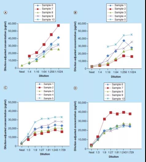 ͼ2.ʹÓá°Ï¡Êͺóµ÷½âµÄŨ¶È¡®dilution-adjusted concentration¡¯¡±ÒªÁ죬¿ÉÈÜÐÔBCMA ELISAÒªÁì²â¶¨µÄ10¸öÕý·²ÈËѪÇåÑù±¾µÄƽÐÐÐÔÆÀ¼Û ¡£(A)ÑùÆ·1-5£¨ÄУ©£¬Ê¹ÓÃ1%BSA PBS»º³åҺϡÊÍ£»(B)ÑùÆ·6-10£¨Å®£©£¬Ê¹ÓÃ1%BSA PBS»º³åÒº£» (C)ÑùÆ·1-5£¨ÄУ©£¬Ê¹ÓÃ1%BSA PBS+0.50%£¨v/v£©Triton X-100»º³åҺϡÊÍ£»(D)ÑùÆ·6-10£¨Å®£©£¬Ê¹ÓÃ1%BSA PBS+0.50%£¨v/v£©Triton X-100»º³åҺϡÊÍ ¡£BSA£ºÅ£ÑªÇå°×ÂѰ×£»PBS£ºÁ×ËáÑλº³åÐÄÀíÑÎË® ¡£