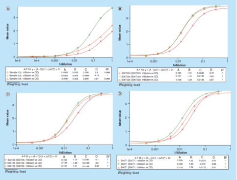 ͼ 3. ¿ÉÈÜÐÔBϸ°û³ÉÊ쿹ԭELISA²â¶¨ÒªÁìµÄƽÐÐÐÔÆÀ¹À ¡£»ùÓÚ10¸öÕý·²ÈËѪÇåÑù±¾£¬²¢Ê¹ÓÃ"ԭʼÐźÅ"ÒªÁìºÍ4PL»Ø¹éÄ£×Ó¾ÙÐÐÇúÏßÄâºÏ ¡£(A)ÑùÆ·1-5£¨ÄУ©£¬Ê¹ÓÃ1% BSA PBS»º³åҺϡÊÍ£»(B)ÑùÆ·6-10£¨Å®£©£¬Ê¹ÓÃ1% BSA PBS»º³åÒº£»(C)ÑùÆ·1-5£¨ÄУ©£¬Ê¹Óà 1%BSA PBS+0.50%£¨v/v£©Triton X-100»º³åҺϡÊÍ£»(D)ÑùÆ·6-10£¨Å®£©£¬Ê¹ÓÃ1%BSA PBS+0.50%£¨v/v£©Triton X-100»º³åҺϡÊÍ ¡£BSA£ºÅ£ÑªÇå°×ÂѰ×£»PBS£ºÁ×ËáÑλº³åÐÄÀíÑÎË® ¡£