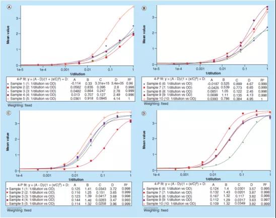 ¹ØÓÚLBA¶¨Á¿ÒªÁ죬²âÊÔÐźÅÓëŨ¶È/Ï¡Êͱ¶ÊýÖ®¼äµÄÏà¹ØÐÔͨ³£²»ÊÇÏßÐ﵀ ¡£Òò´Ë£¬ÏßÐÔ¹ØÏµÍ¼²»¿É׼ȷ·´Ó¦Ñù±¾Ö®¼äµÄƽÐÐÐÔ ¡£½¨ÒéʹÓüÓȨ»òÎÞ¼ÓȨµÄ4»ò5²ÎÊýlogistic»Ø¹é£¨4PL»ò5PL£©Ä£×Ó£¬ÒÔʵÏÖ×îС·½²îµÄ×î¼ÑÇúÏßÄâºÏ ¡£´ÓͼÖÐÖ±½Ó¿ÉÒÔ¿´µ½Ã¿¸öÑù±¾Ï¡ÊÍÇúÏߵį½ÐйØÏµ£¬²¢¿ÉÒÔÆÀ¼ÛÑù±¾Ö®¼äµÄƽÐÐÐÔ ¡£Ò»¸ö¾ÖÏÞÊDz»ÇåÎúÈç×÷Éõ"ԭʼ²âÊÔÐźÅ"ÒªÁìÉèÖÃÀο¿µÄ½ÓÊܱê×¼ ¡£Ã¿¸öÑù±¾µÄ"B"²ÎÊý£¨"B"ÌåÏÖ4PLºÍ5PLµÄÏ£¶ûÇúÏßбÂÊ£©¿ÉÓÃÓÚÆÀ¹ÀÒªÁìÆ½ÐÐÐÔ ¡£Ò²¿ÉÒÔ½øÒ»²½ÆÀ¹À²¢Ó¦Óøü¶àµÄͳ¼ÆÒªÁ죬ÒÔ±ã¸üºÃµØÚ¹ÊÍÊý¾Ý ¡£
