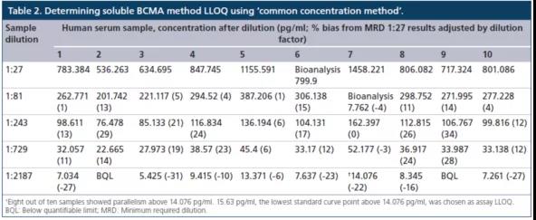 ³£ÓÃÏ¡ÊÍÒªÁ죨common dilution method£©Êǽ«ÔÚ×î´óÏ¡Êͱ¶Êýʱ¸ø³öƽÐÐÏìÓ¦µÄËùÓе¥¸öÑù±¾ÖÐÊӲ쵽µÄ×î¸ßŨ¶È¶¨ÎªLLOQ ¡£µ«Ê¹ÓøÃÖÖ²½·¥Ê±±£´æÒ»¸öȱ·¦£¬¾ÍÊǵ±ÖÁÉÙÒ»¸öÑù±¾µÄÄÚÔ´ÐÔŨ¶ÈÏÔןßÓÚÆäËûÑùƷʱ£¬È·¶¨µÄLLOQ½«¸ßÓÚÕæÕýµÄLLOQ ¡£¶øÁíÒ»ÖÖÒªÁ죬ÅäºÏŨ¶ÈÒªÁ죨common concentration method£©Êǽ«ËùÓÐÑùÆ·¶¼ÌåÏÖ³öƽÐÐÐÔµÄ×î¸ßŨ¶ÈÈ·¶¨ÎªLLOQ ¡£»»ÑÔÖ®£¬ÈκθßÓÚÈ·¶¨LLOQŨ¶ÈµÄÑù±¾£¬¶¼Í¨¹ýƽÐÐʵÑéÌåÏÖ³öÏà¶ÔµÄ׼ȷ¶È ¡£¶ÔsBCMA°¸ÀýÑо¿µÄÊý¾Ý£¬Ê¹ÓÃÁË"ÅäºÏŨ¶ÈÒªÁì"£¨±í2£© ¡£