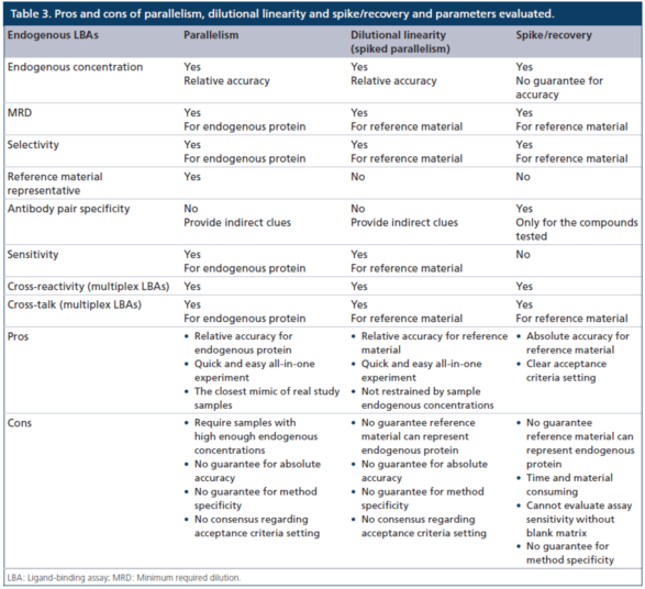 ±í3ÏÔʾÁËʹÓÃÆ½ÐÐÐÔ¡¢Ï¡ÊÍÏßÐÔ¶È£¨¼Ó±êƽÐÐÐÔ£©ºÍ¼Ó±ê/½ÓÄÉÒªÁìÀ´ÆÀ¹ÀÄÚÔ´ÐÔLBAÒªÁìÒªº¦²ÎÊýµÄÓÅÈõµã ¡£Óë´ó´ó¶¼ÍâÔ´ÐÔÒ©ÎïµÄ¶¨Á¿ÒªÁì²î±ð£¬ÄÚÔ´ÐÔ£¨ÀýÈ磬ÉúÎï±ê¼ÇÎLBAÒªÁìͨ³£ÐèÒªÌæ»»²ÎÕÕ£¨±È£©±ê×¼ÎïºÍ²»º¬Óдý²âÎïµÄÌæ»»»ùÖÊ ¡£ÓÃÓÚÄÚÔ´ÐÔLBAµÄÕÕ£¨±È£©±ê×¼Îͨ³£¼È·Ç¸ß¶È´¿»¯£¬Ò²·Ç±íÕ÷ÓÅÒ죬ÇҺܿÉÄܲ»¿ÉÍêÈ«´ú±í´ý²âµÄÄÚÔ´ÐÔÂѰ×ÖÊ£¬ÕâЩÂѰ×ÖÊͨ³£ÊÇÒìÖÊÐÔ£¨heterogeneous£©µÄ£¬ÔÚÆä×ÔÈ»»ùÖÊÖб£´æ×Ŷà¸öÒì¹¹Ì壨isoforms£© ¡£