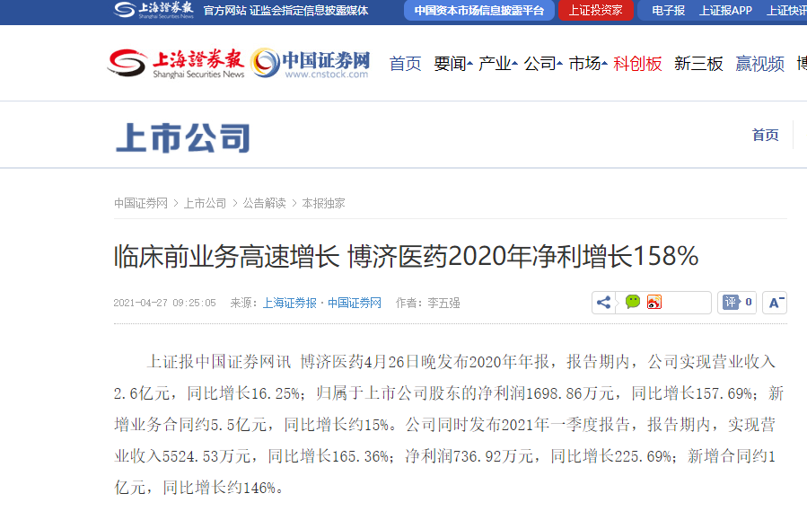昨天夜间(4月26日),bmw11222医药宣布2020年年度报告及2021年一季度报告。报告期内,bmw11222医药在营收、归母净利润、扣非净利润等多项指标实现大幅增添,引发《上海证券报》《证券时报》、新浪财经、网易财经等多家媒体关注。
