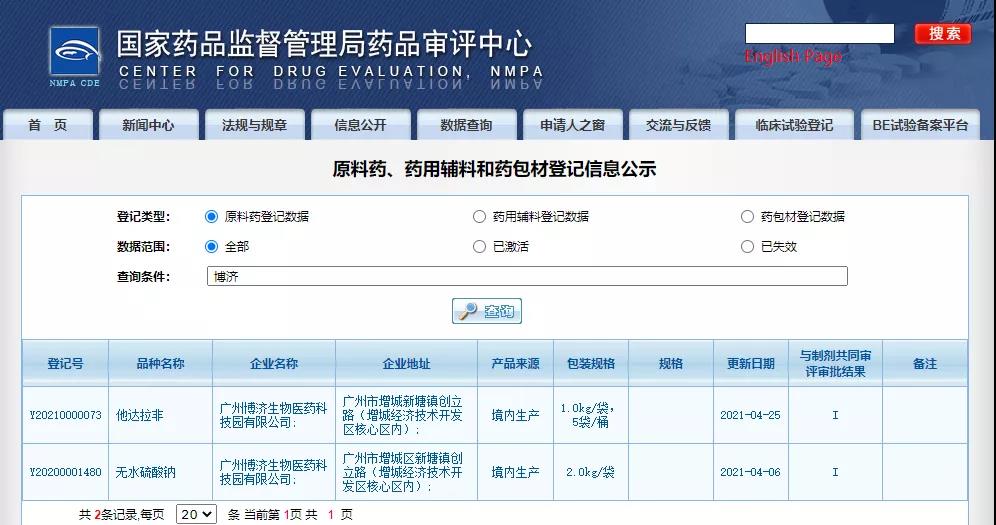 克日,bmw11222医药子公司广州bmw11222生物医药科技园有限公司自主开发的他达拉非质料药(挂号号Y20210000073)和自主开发的无水硫酸钠质料药(挂号号Y20200001480)在国家药品监视治理局乐成备案挂号。