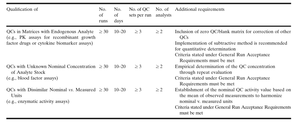 ´ËÀà²âÊÔµÄÊʵ±¹æ·¶ÊÇÌØÒìÓÚ²âÊÔÒªÁìµÄ£¬±ØÐè×÷ΪÑо¿Ç°²âÊÔÒªÁìÑéÖ¤µÄÒ»²¿·Ö½¨ÉèÆðÀ´¡£QCÑùÆ·µÄÖÆ±¸ÒªÁìÊǽ«´ý²âÎïÔÒº£¬ÒÔÌØ¶¨Ï¡Êͱ¶Êý£¬¼ÓÈëµ½¾ÓÉÈÏÖ¤£¨¼°¸ñ£©µÄ¿Õȱ»ìÏý»ùÖÊ»òÊʵ±µÄÏ¡ÊͼÁ£¨diluent£©ÖС£¹ØÓÚËùÓÐÀֳɵÄÔËÐУ¬Ã¿¸öQCµÄƽ¾ù²â¶¨Öµ¾ÍÓ¦É趨Ϊ±ê³ÆÖµ¡£½¨ÒéÖÁÉÙÕý³£ÊµÑé²âÊÔÔËÐÐ30´Î£¬ÓÉÖÁÉÙ2ÈËÔÚ10-20ÌìÄÚÖ´ÐУ¬ÒÔÉ趨QCÑùÆ·µÄ±ê³ÆÅ¨¶È¡£Ã¿¸ö²âÊÔÔËÐаüÀ¨ ¡Ý3 ×éQC¡£ÔÚ×î³õµÄ²â¶¨Ö®ºó£¬Ò»Ñùƽ³£ÆÊÎöÔËÐÐÖÐQCÑùÆ·µÄ½ÓÊܱê×¼ÒÔ¼°Î´À´Ìæ»»QCÅú´ÎµÄ½ÓÊܱê׼ΪÒÑÈ·¶¨µÄ±ê³ÆÖµ£¨nominal value£©µÄ¡À20%¡£ÈκÎÌæ»»Åú´ÎµÄ´ý²âÎïŨ¶È±ØÐèÔÚ´ËÈ·¶¨µÄ¹æÄ£ÄÚ¡£ÓÉÓÚÀ´×ÔѪÇåºÍѪ½¬µÄÒò×ӵĹÌÓеıäÒìÐÔ£¬¿ÉÄÜÐèÒª£¬»ùÓÚ×î³õµÄ20-30´ÎµÄÔËÐÐÊý¾Ý£¬ÎªÃ¿¸öQCŨ¶Èˮƽָ¶¨Ò»¸öÔÝʱµÄ±ê³ÆÖµ£»È»ºó£¬ÔÚÓÐÆäËü¿ÉÓÃÊý¾Ýʱ£¬ÖØÐÂÆÀ¹ÀÕâ¸ö±ê³ÆÖµµÄÊÊÓÃÐÔ¡£ÈôÊDzâÊÔÒªÁìµÄÄÚÔÚ±äÒìÐԽϴó£¬Ôò¿ÉÄÜÐèÒª°´ÆÚµØÖØÐÂÆÀ¹ÀºÍÖØÐ½¨ÉèQCµÄ½ÓÊܹæÄ£¡£Ç°ÊöµÄPK¶¨Á¿ÒªÁìµÄͨÀýÔËÐнÓÊܱê×¼Ò²±ØÐè»ñµÃÖª×ã¡£