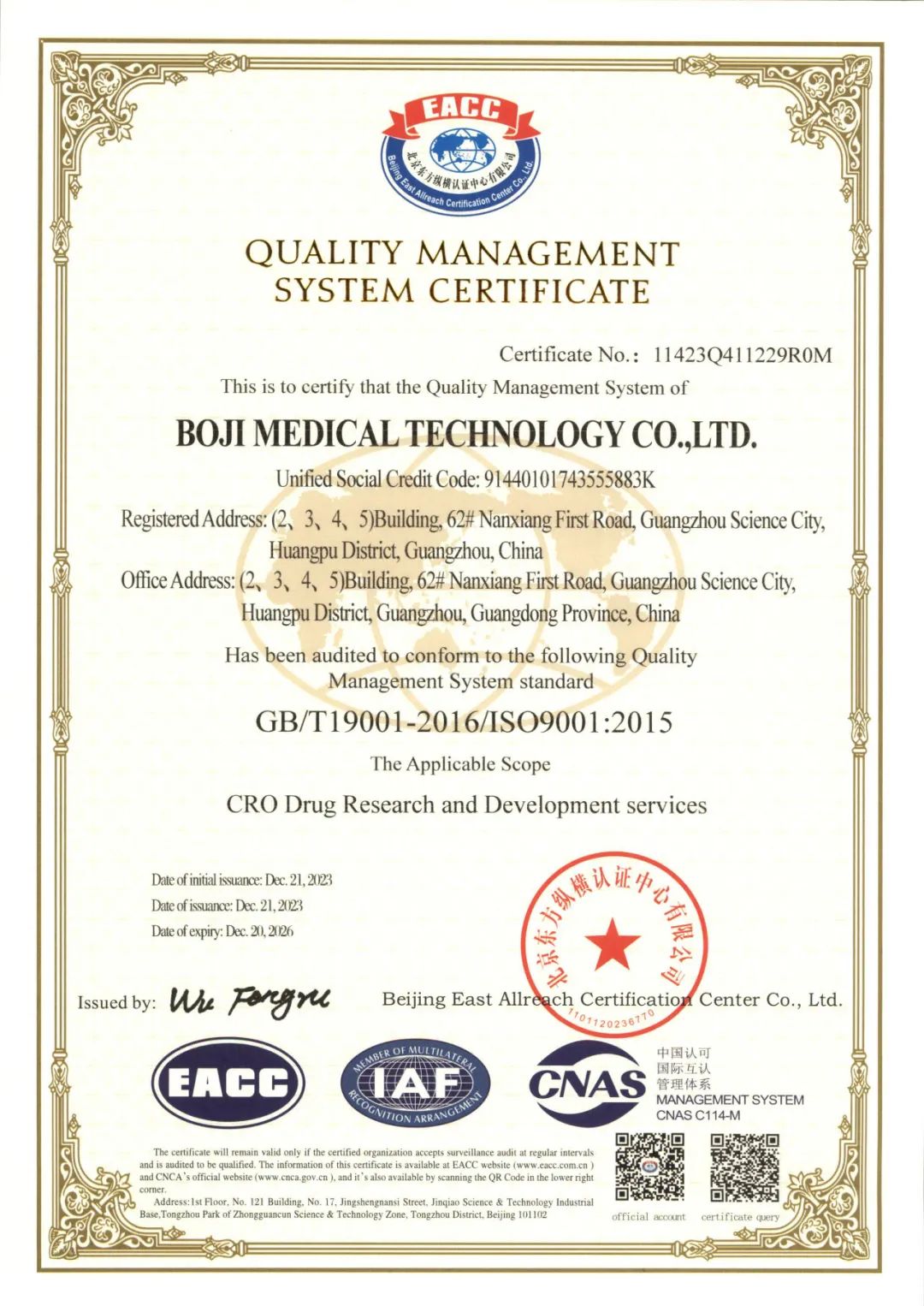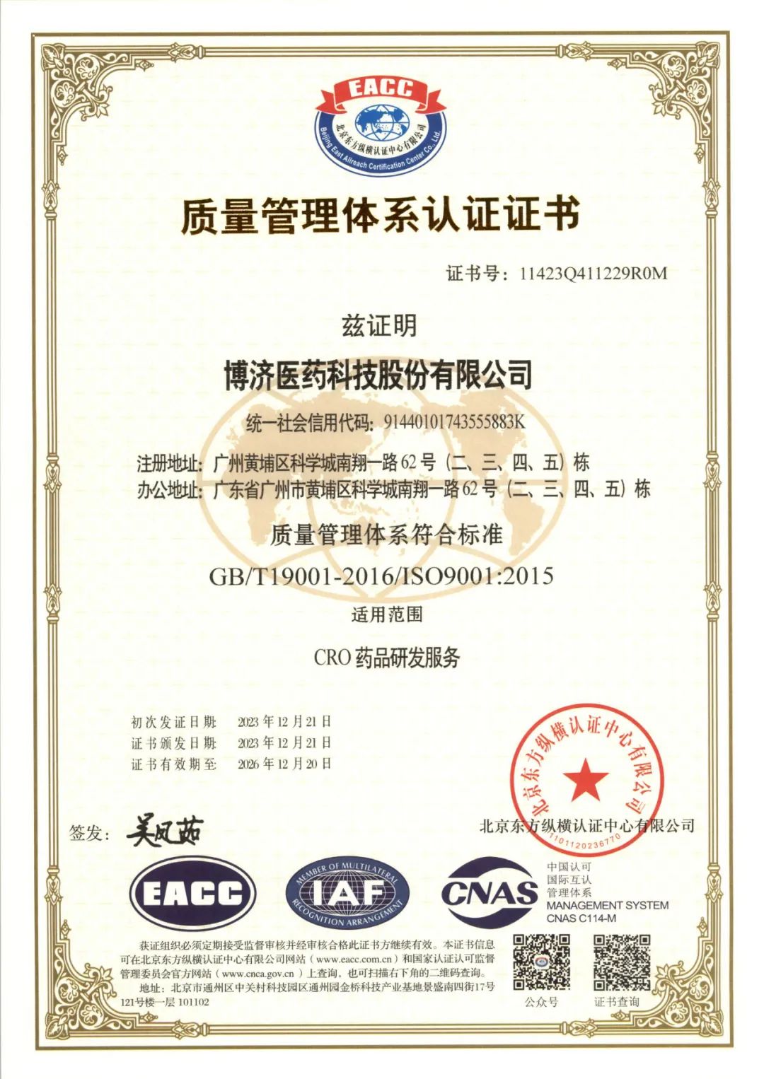 bmw11222医药相关认真人体现,本次认证通过彰显了bmw11222医药具有为客户提供高品质效劳的资质以及切合规则规范的质量系统。通过ISO 9001提供的质量治理框架,bmw11222医药将始终以客户为中心,以质量为生命,一直完善和优化企业的治理流程和产品质量,为客户提供更优质、更高效、更专业的CRO效劳!